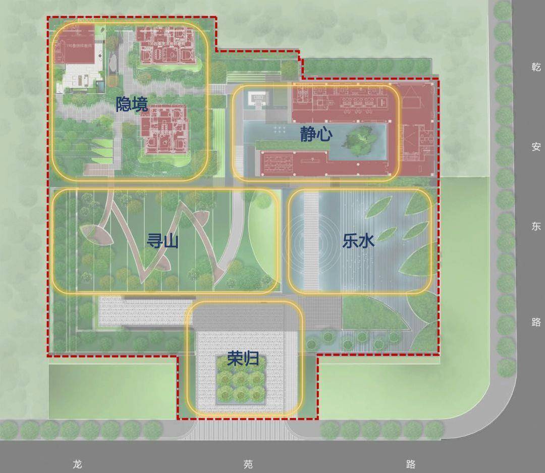 中建宸廬詩畫園林示范區,采用景觀遞進和移步換景的設計手法,通過“榮歸—樂水—靜心—尋山—隱境”的有機動線,將王維的山水情懷貫穿其間,濃蔭之下,屋脊隱現,曲徑通幽,移步異景。